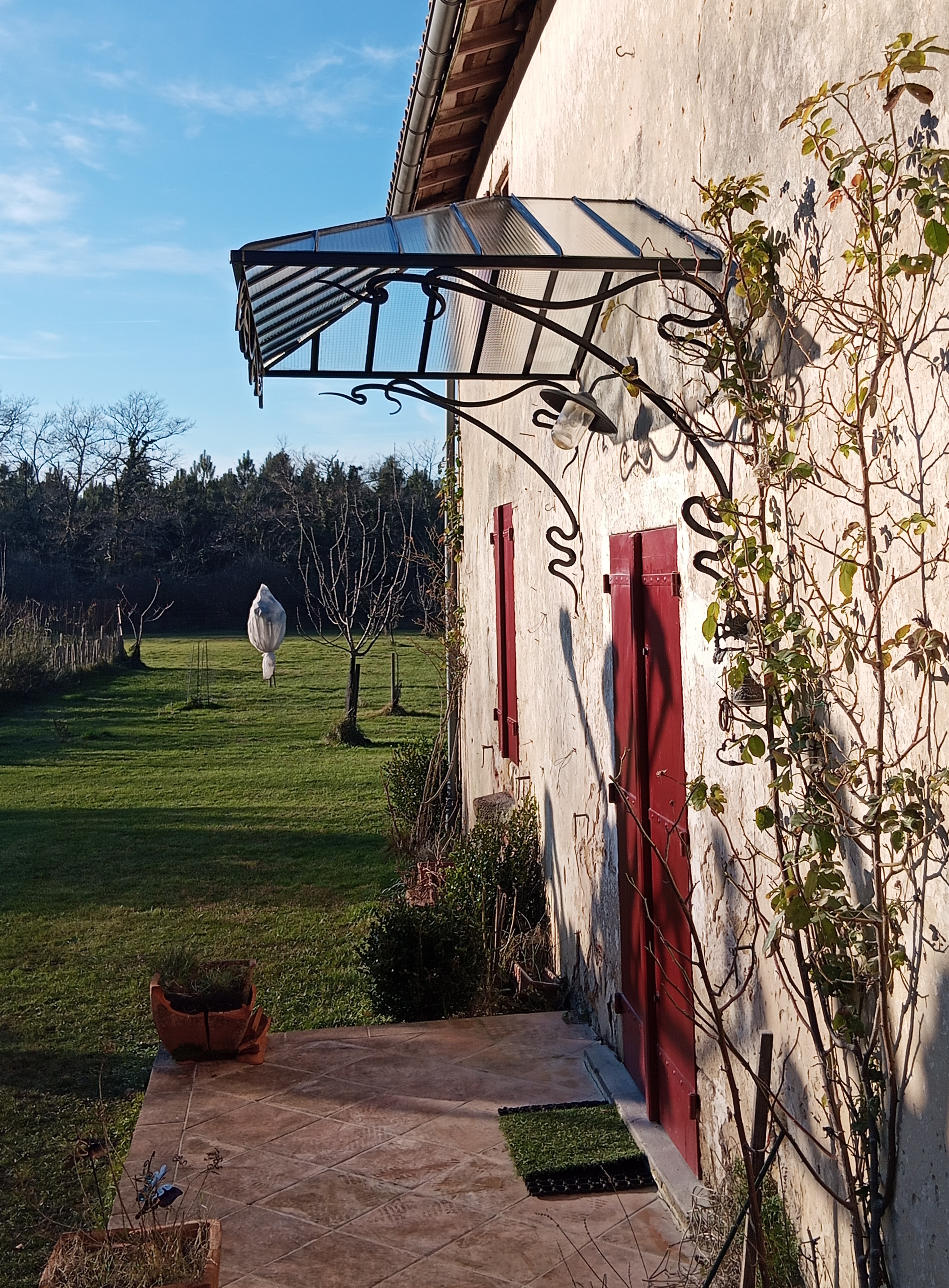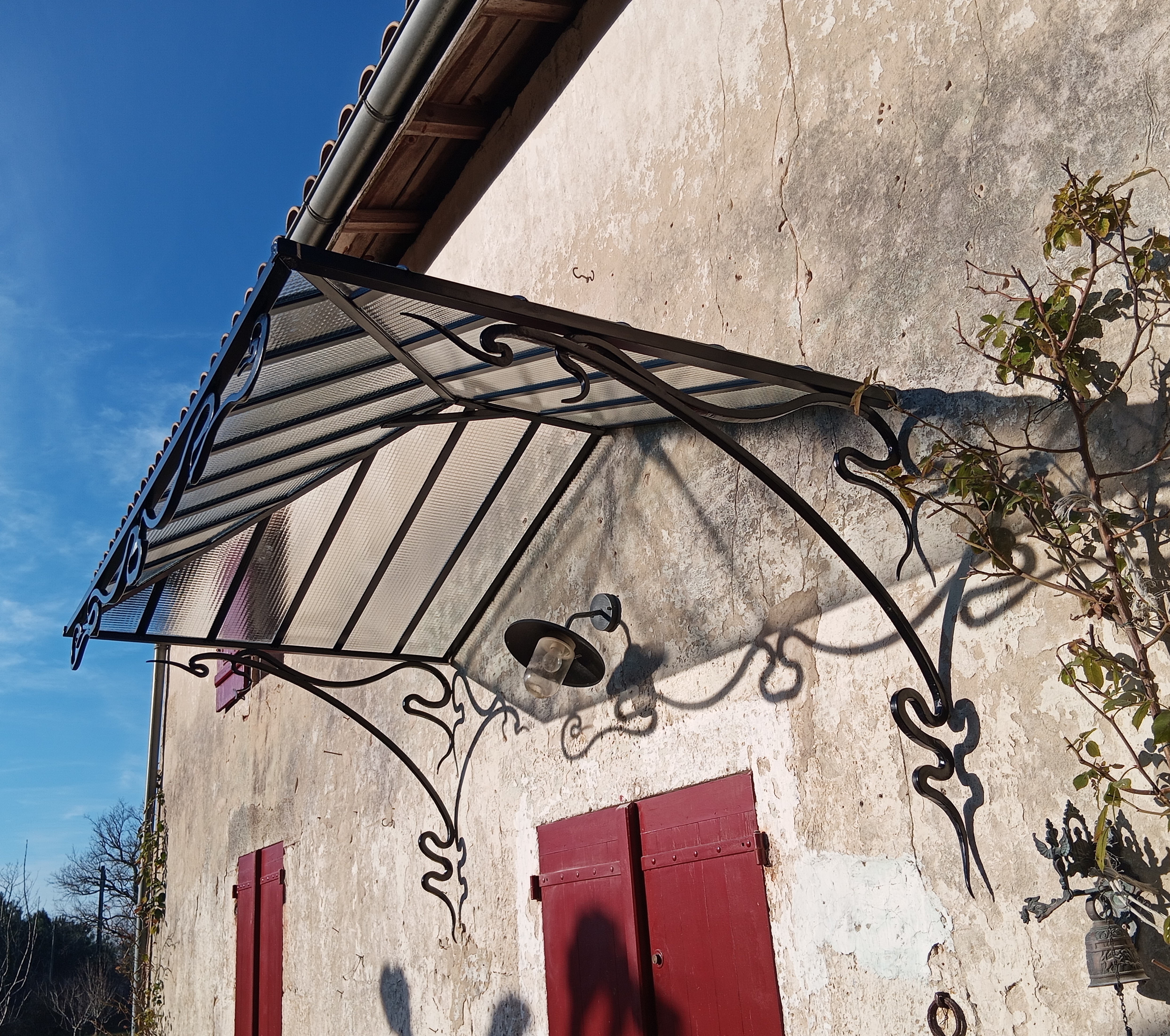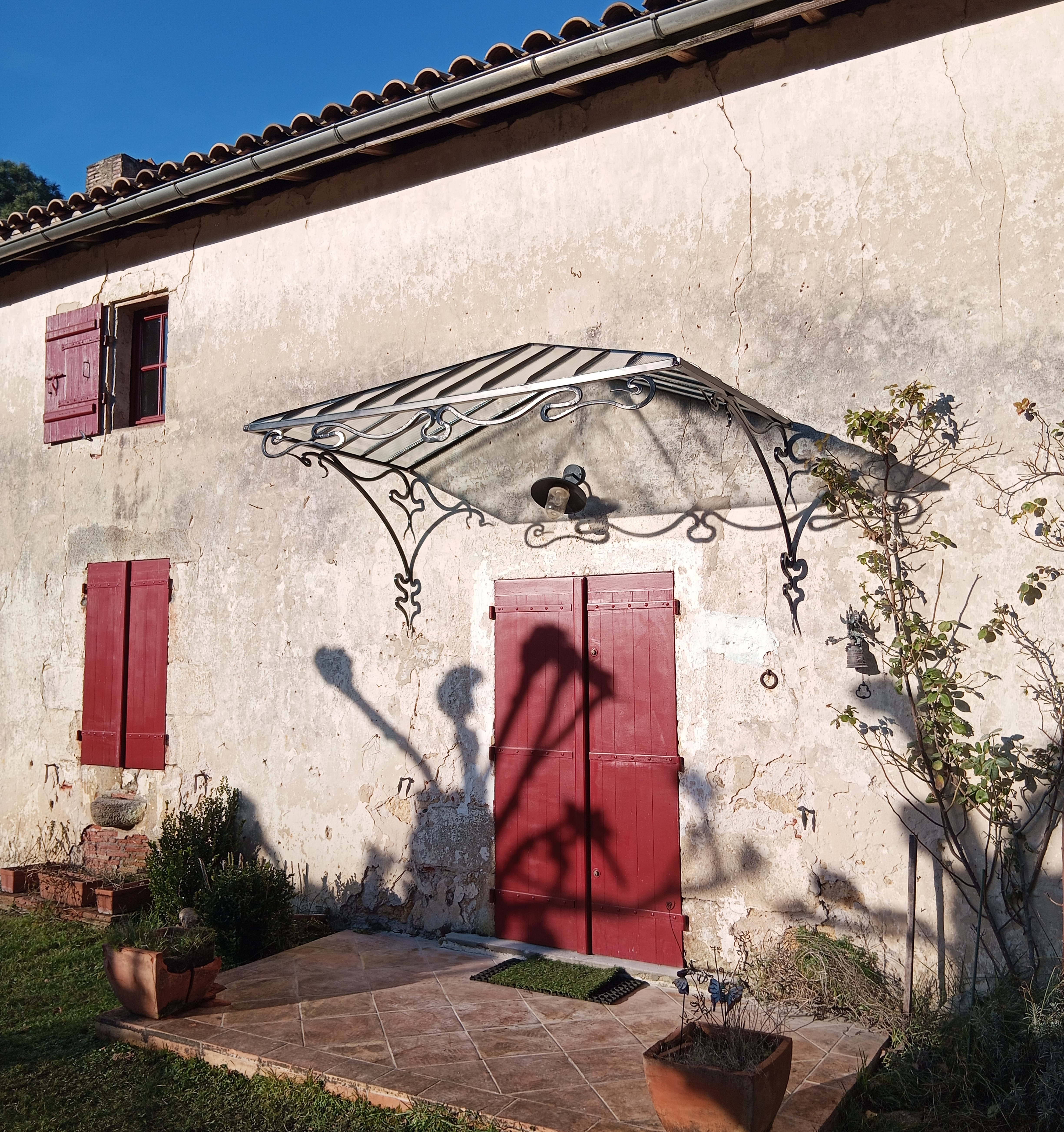 Marquise en fer forgé et verre sécurisé de style Art Nouveau, soigneusement fabriquée et posée sur mesure près de Bordeaux.