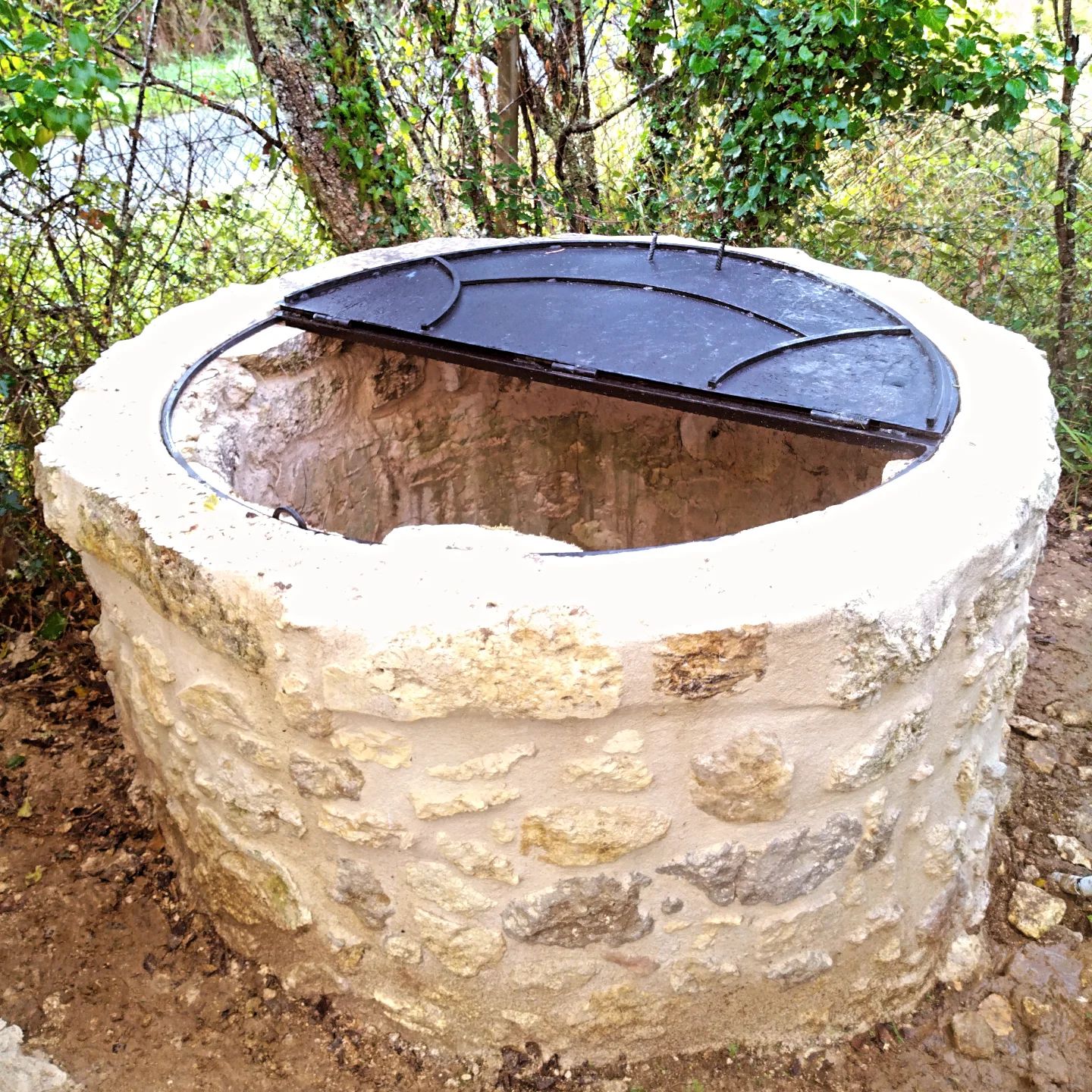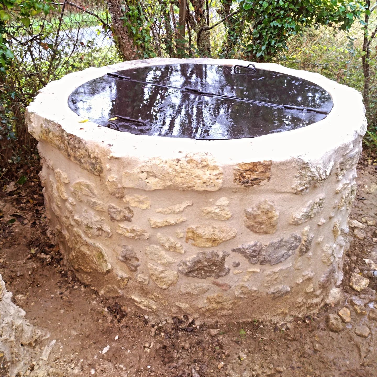 Réfection d’un ancien puit en moellons au mortier de chaux et pose d’une trappe de sécurité.
